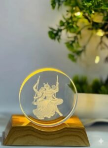 Elegant Radha Krishna LED crystal showpiece with wooden base. Perfect for home decor, gifting, pooja room & festivals. Divine light glow for peaceful ambience.